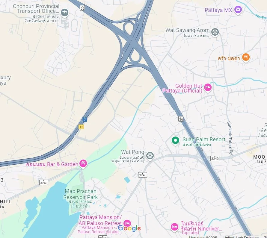 We are a short 5 minute drive from the north east side of Maprachan lake or 15 minutes drive from central Pattaya if you take motorway 7 heading towards Bangkok. Click on the map for more details.